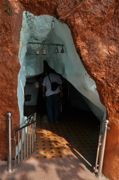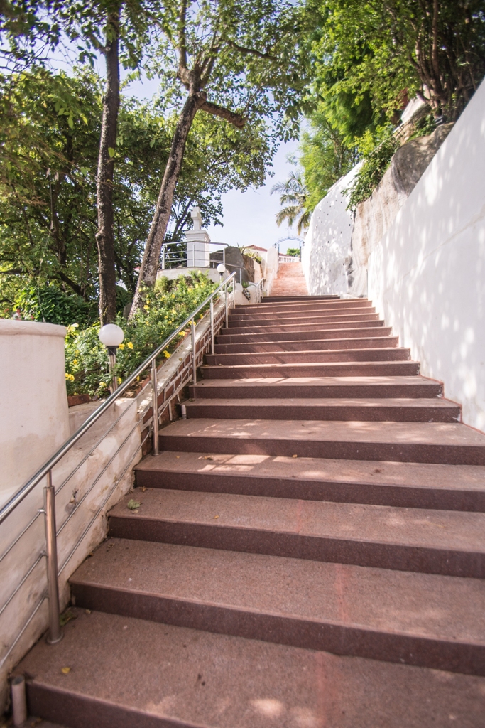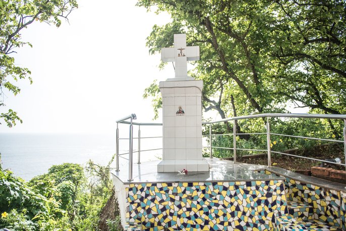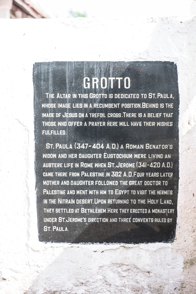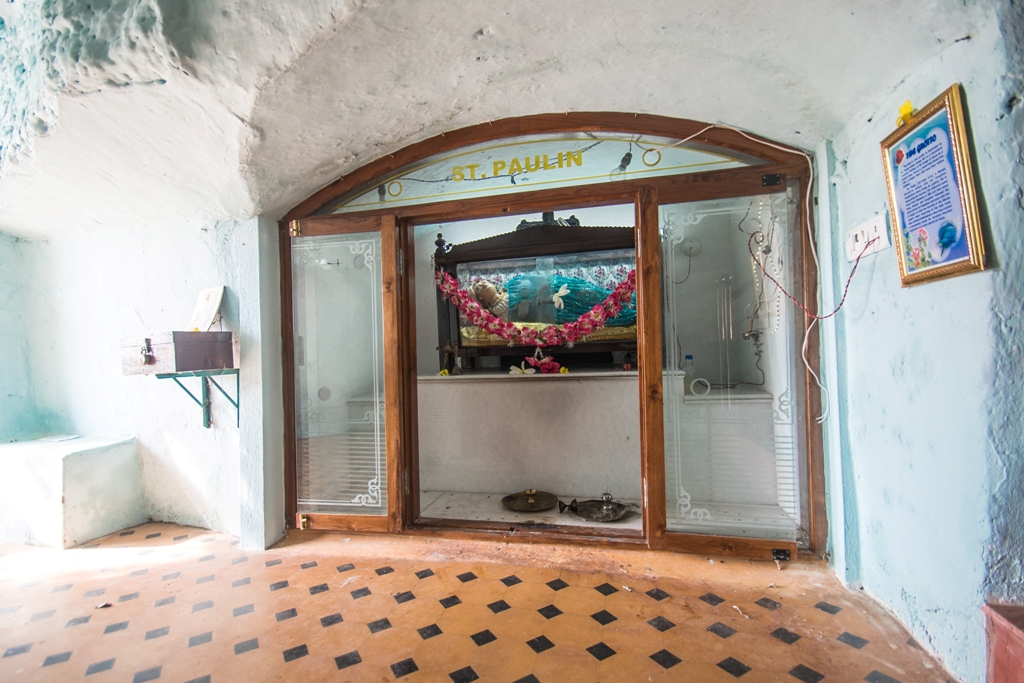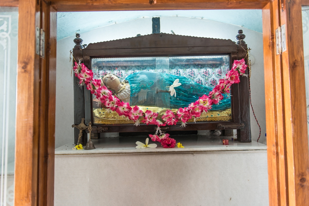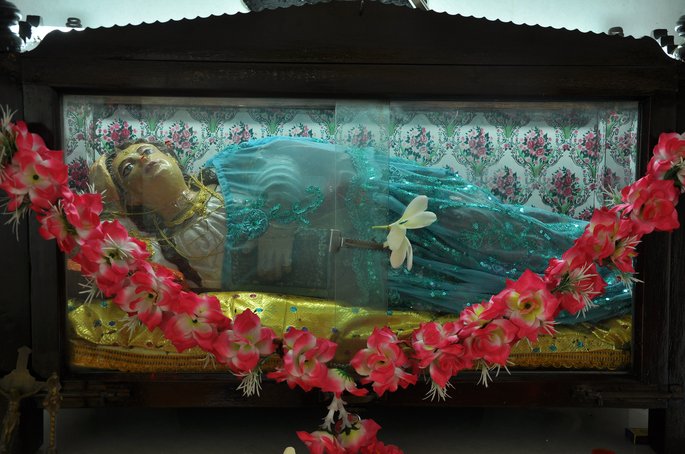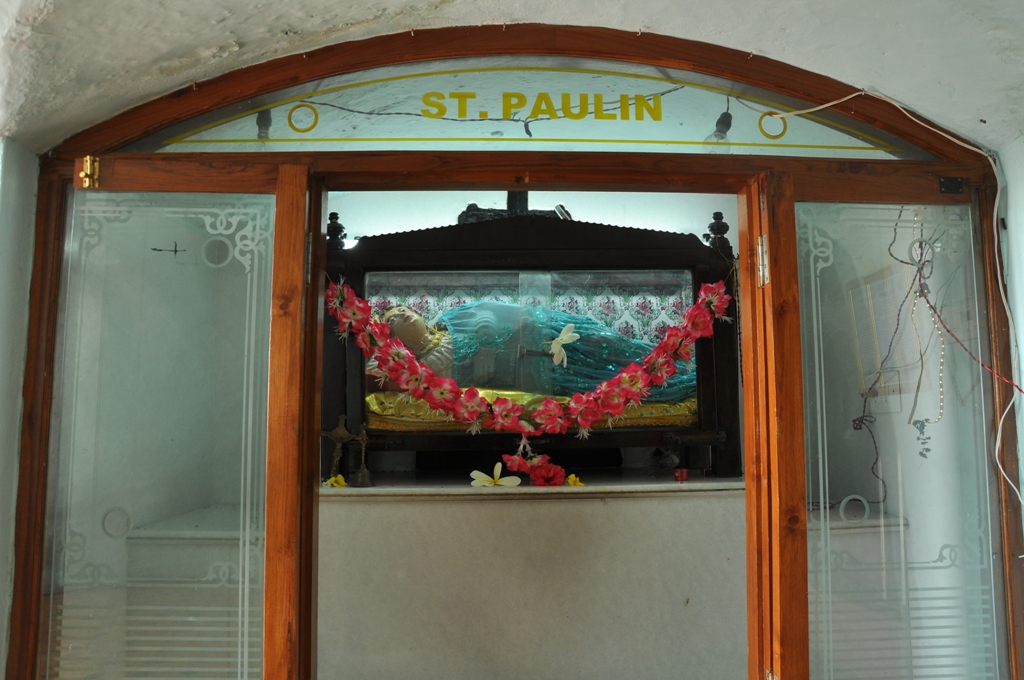 A short distance away from the chapel, laterite steps lead down to a grotto where there is an altar dedicated to Santa Paula. Her image lies in a recumbent position. Her legs are maimed. Behind St. Paula is the image of Jesus Christ on a trefoil cross. How this statue of Santa Paula came to the grotto is shrouded in mystery. There is a legend that the figure was washed ashore. It was thrown back into the sea by the villagers but it kept coming back. It was then placed in the grotto by the villagers. There is a belief that anyone who prays to Santa Paula and lights a candle, has his wish fulfilled. Santa Paula lived from 347 to 404 AD. She hailed from an illustrious Roman family and was a staunch devotee of St. Jeromme. On losing her husband, she donated all her property to charity. She followed St. Jeromme on a pilgrimage to Bethlehem, alongwith her daughter and a group of Roman ladies who had vowed to lead a life of religious austerity. They settled down in a convent around the Basilica of the Nativity in Bethlehem.